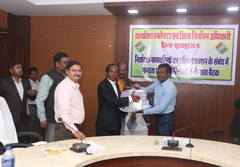 जिला निर्वाचन अधिकारी ने राजनैतिक दलों के प्रतिनिधियों को साझा की अंतिम मतदाता सूची सिंधु स्वाभिमान समाचारपत्र सूरजपुर 27 अक्टूबर 2025 से शुरू हुए एसआईआर अभियान के विभिन्न चरणों के प्रभावी संचालन के बाद अर्हतः तिथि 01 जनवरी 2026 के आधार पर आज 21 फरवरी को निर्वाचक नामावली का अंतिम प्रकाशन जिला संयुक्त कार्यालय के