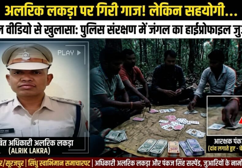 सिंधु स्वाभिमान समाचारपत्र रामानुजनगर/सूरजपुर | कुमेली घाट के जंगलों में चल रहे हाईप्रोफाइल जुआ फड़ के वीडियो ने सूरजपुर पुलिस की चूलें हिला दी हैं। जहाँ एक ओर वीडियो वायरल होने के बाद एसएसपी प्रशांत कुमार ठाकुर ने त्वरित कार्रवाई करते हुए रामानुजनगर थाना प्रभारी अलरिक लकड़ा और आरक्षक पंकज सिंह को निलंबित कर दिया