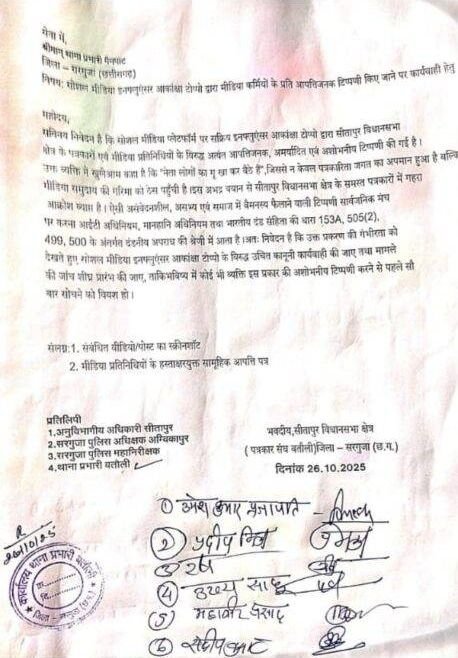 सिंधु स्वाभिमान समाचारपत्र सीतापुर क्षेत्र के पत्रकार सोशल मीडिया इनफ्लुएंसर आकांक्षा टोप्पो के विवादित बयान के विरोध में लामबंद हो गए हैं। वायरल वीडियो में आकांक्षा टोप्पो द्वारा पत्रकारों एवं मीडियाकर्मियों के खिलाफ अभद्र एवं आपत्तिजनक शब्दों का प्रयोग किए जाने से पत्रकार समुदाय में गहरा आक्रोश व्याप्त है।आहत पत्रकारों ने सरगुजा पुलिस अधीक्षक के नाम थाना प्रभारी बतौली को एक ज्ञापन सौंपा, जिसमें संबंधित वायरल वीडियो की जांच कर अभद्र शब्दों के प्रयोग करने पर आकांक्षा टोप्पो के खिलाफ कड़ी एवं ठोस कार्रवाई की मांग की गई है। पत्रकारों ने कहा कि सोशल मीडिया प्लेटफॉर्म पर इस तरह के बयान समाज में पत्रकारों की गरिमा को ठेस पहुँचाते हैं। यदि शीघ्र कार्रवाई नहीं की गई, तो वे संगठित आंदोलन करने को बाध्य होंगे। पत्रकारों ने प्रशासन से यह भी मांग की है कि ऐसे मामलों में साइबर सेल सक्रिय भूमिका निभाते हुए भ्रामक एवं अपमानजनक सामग्री फैलाने वालों पर सख्त कदम उठाए।