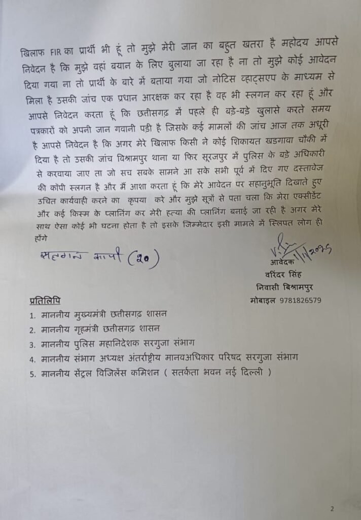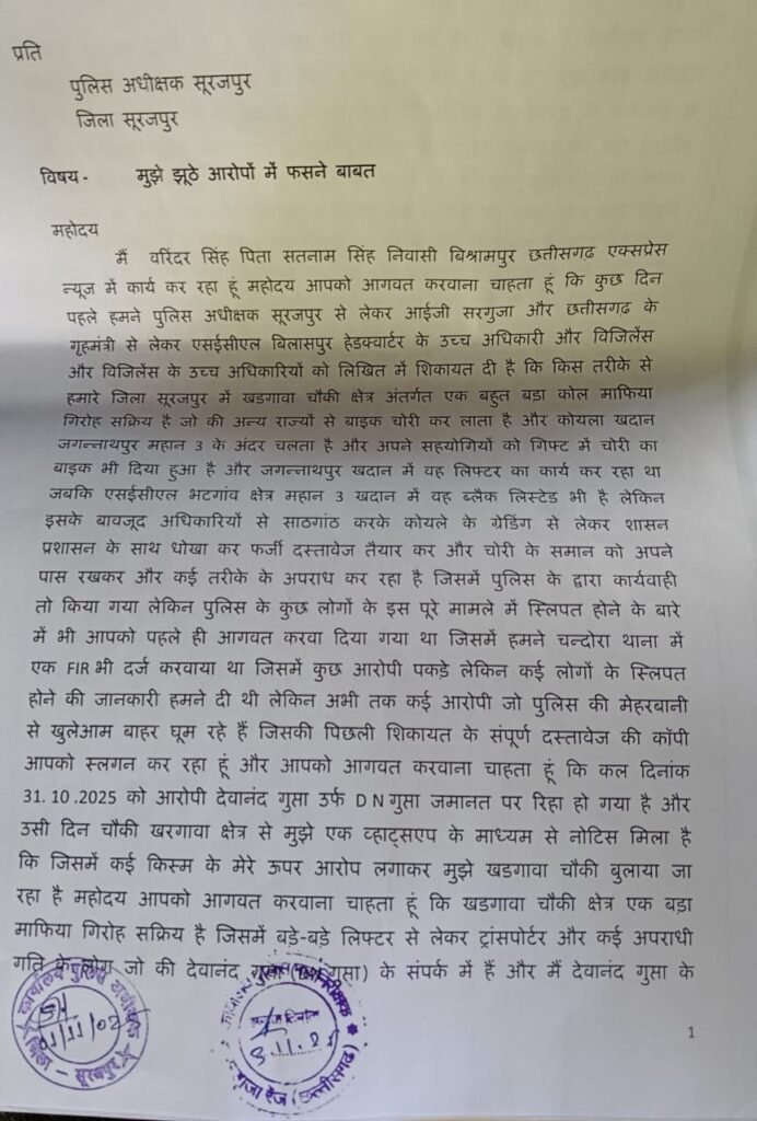 सिंधु स्वाभिमान समाचारपत्र सूरजपुर आज कल निष्पक्ष पत्रकारिता करना का मतलब कहीं का कहीं अपने और अपने परिवार को जोखिम में डालना हो गया है,आज अगर आप कोई निष्पक्षरूप से कोई समाचार का प्रकाशन करते हैं तो माफिया और उनके आश्रित शासकीय लोग उस पत्रकार को काफी हेय दृष्टि से देखते हैं मानो उस पत्रकार के खबरों के चलते माफियाओं और इन लोगों के पेट पर लात मार दिया हो ।आवेदक वरिंदर सिंह जो कि छत्तीसगढ़ एक्सप्रेस के प्रतिनिधि हैं उन्होंने विगत कुछ दिनों पूर्व कोयला माफियाओं चोरी गिरोह के विरुद्ध खबर लगाई थी आज उन्हें झूठे मामले में फसाने के लिए एक सामूहिक षडयंत्र काम कर रहा है। पत्रकार वरिंदर सिंह ने अपने आवेदन में बताया है कि आपको आगवत करवाना चाहता हूं कि कुछ दिन पहले हमने पुलिस अधीक्षक सूरजपुर से लेकर आईजी सरगुजा और छत्तीसगढ़ के गृहमंत्री से लेकर एसईसीएल बिलासपुर हेडक्वार्टर CMD और विजिलेंस और विजिलेंस के उच्च अधिकारियों को लिखित में शिकायत दी है कि किस तरीके से हमारे जिला सूरजपुर में खडगावा चौकी क्षेत्र अंतर्गत एक बहुत बड़ा कोल माफिया गिरोह सक्रिय है