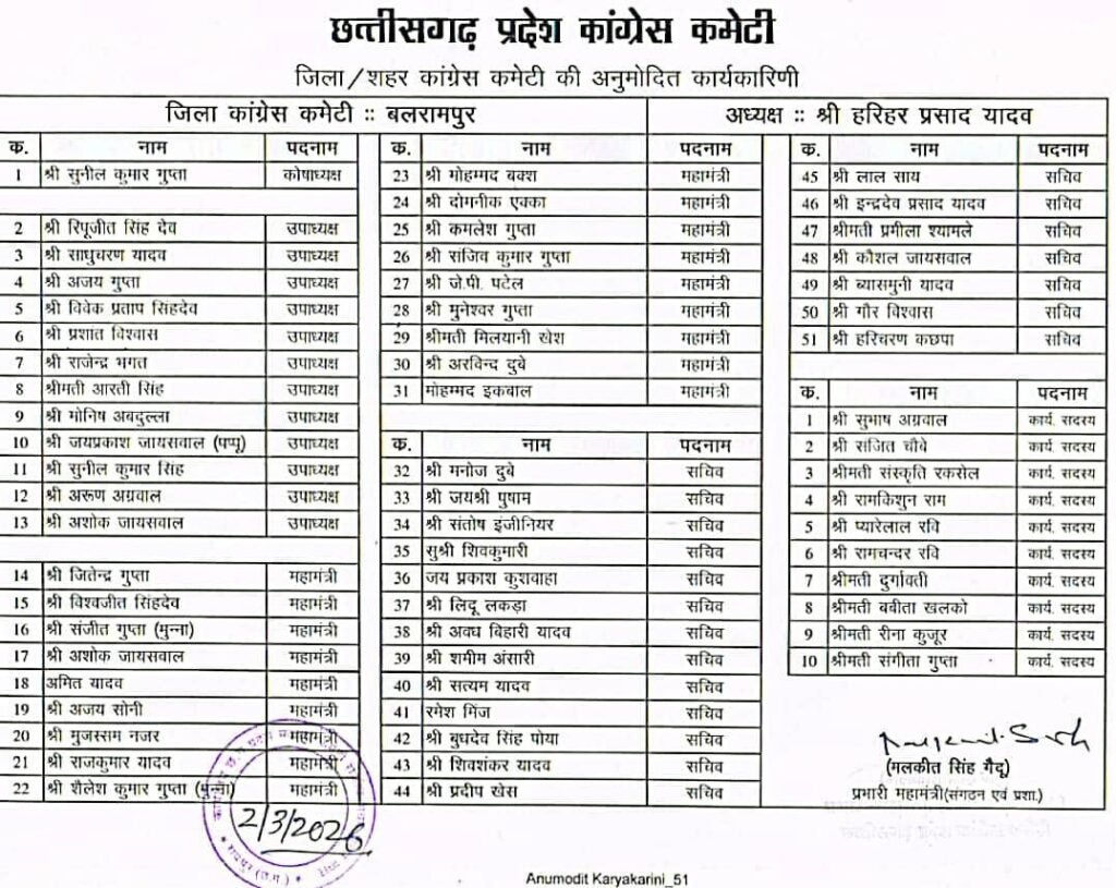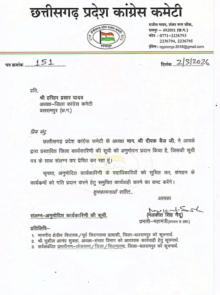 कांग्रेस संगठन ने उम्मीद जताई है कि नई कार्यकारिणी जनता से जुड़े मुद्दों को मजबूती से उठाएगी और जिले में पार्टी की पकड़ को और सुदृढ़ करेगी।