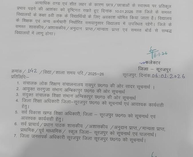 सिंधु स्वाभिमान समाचारपत्र सूरजपुर अत्याधिक ठण्ड एवं शीत लहर के कारण छात्र / छात्राओं के स्वास्थ्य पर प्रतिकूल प्रभाव पड़ने की आशंका को दृष्टिगत रखते हुए दिनांक 10.01.2026 तक जिले के समस्त विद्यालयों के कक्षा 5वी तक के विद्यार्थियों के लिए अवकाश घोषित किया जाता है। विद्यालय के शिक्षक एवं अन्य कर्मचारी निर्धारित समयानुसार विद्यालय